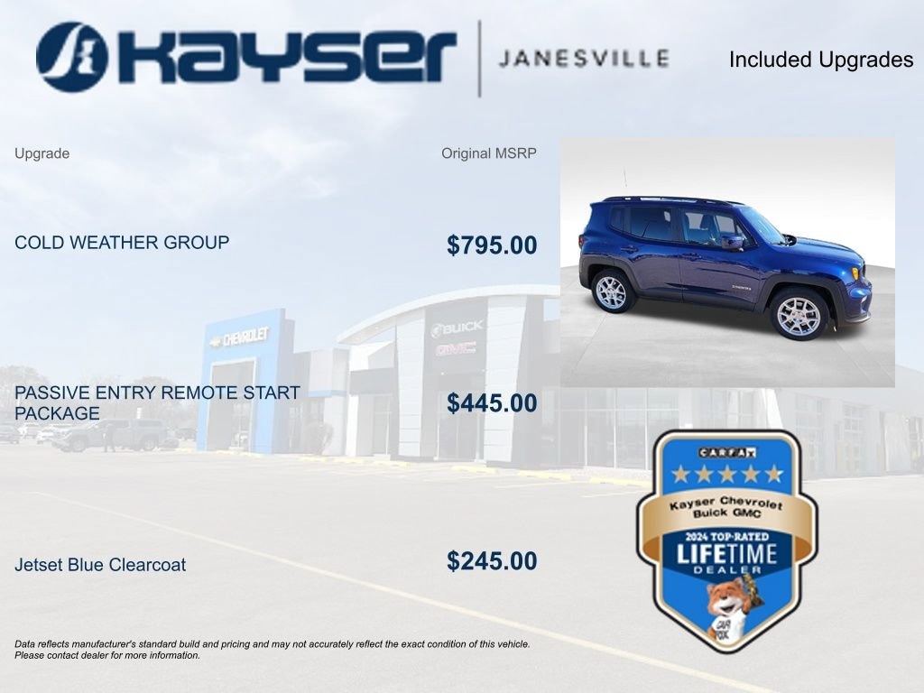 The 2020 Jeep Renegade Latitude is a compact SUV that offers the perfect blend of style, capability, and convenience. With its striking Jetset Blue Clearcoat exterior and well-appointed interior, this Renegade is sure to turn heads wherever you go.- Cold Weather Group (Leather Wrapped Steering Wheel, Windshield Wiper De-Icer, Rain Sensitive Windshield Wipers, Heated Front Seats, Heated Steering Wheel, All-Season Floor Mats)- Passive Entry Remote Start Package (Keyless Entry w/Panic Alarm, Remote Start System)Powered by a 2.4L I4 engine and 9-Speed 948TE Automatic transmission, the Renegade Latitude delivers an impressive 22 city/30 highway MPG, making it a practical choice for your daily commute or weekend adventures. The vehicle's front-wheel-drive system provides confident handling and a smooth ride, while the available all-season tires ensure excellent traction in a variety of weather conditions.Inside, the Renegade Latitude features a wealth of premium amenities, including automatic temperature control, heated door mirrors, Apple CarPlay/Android Auto, and a ParkView Rear Back-Up Camera. The leather-wrapped steering wheel, heated front seats, and heated steering wheel add a touch of luxury, while the 6-speaker audio system with SiriusXM radio ensures your driving soundtrack is always on point.Safety is also a top priority in the Renegade Latitude, with features like electronic stability control, dual front impact airbags, dual front side impact airbags, and an emergency communication system to give you and your loved ones peace of mind on the road.This 2020 Jeep Renegade Latitude is a certified pre-owned vehicle, meaning it has undergone a rigorous inspection and comes with a manufacturer-backed warranty. With its impressive combination of style, technology, and capability, this Renegade is the perfect choice for the discerning SUV buyer.Call or email now! This one won't be here for long! A KAYSER BUYER IS A WISER BUYER! Customers who choose to buy a vehicle from us are making an informed and smart decision due to our transparent pricing, excellent customer service, and commitment to a hassle-free buying experience We do not sell Manufacturer Buybacks/Lemon Law Vehicles or any other vehicle with a bad branded title. For more information call us at 1-608-607-3082 or visit us at www.kayserjanesville.com.