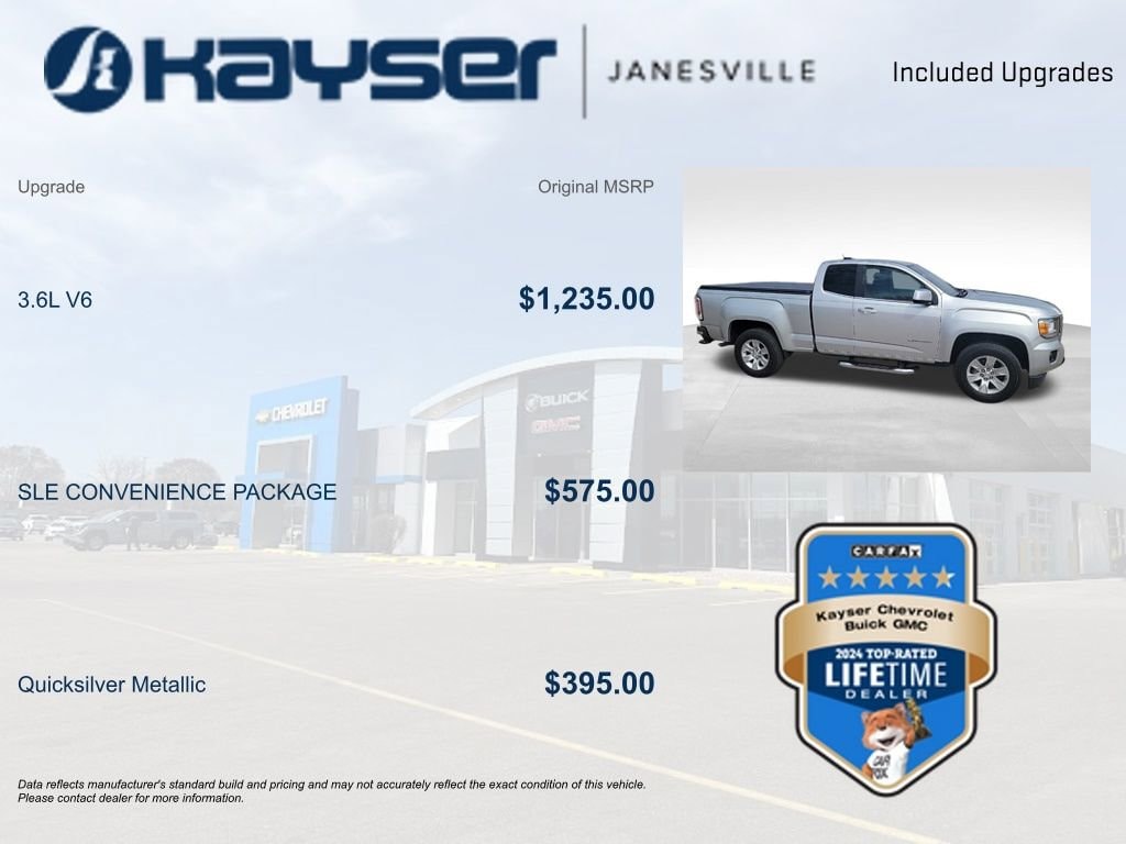 Discover the perfect blend of capability, comfort, and convenience in the 2016 GMC Canyon SLE1. Call or email now! This one won't be here for long! A KAYSER BUYER IS A WISER BUYER! Customers who choose to buy a vehicle from us are making an informed and smart decision due to our transparent pricing, excellent customer service, and commitment to a hassle-free buying experience. We do not sell Manufacturer Buybacks/Lemon Law Vehicles or any other vehicle with a bad branded title. For more information call us at 1-608-607-3082 or visit us at www.kayserjanesville.com.
